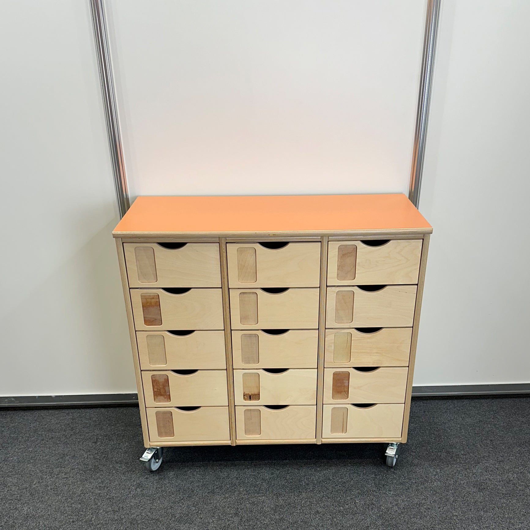 Die Eigentumsfächerschränke werden aus 18 mm Birkensperrholz (Multiplex) hergestellt. Zur Auswahl stehen Schränke mit 10, 15, 20 und 25 Fächern (immer 5 Fächer hoch). Wahlweise kann zwischen Rollen oder Sockel entschieden werden. Praktisch sind die optionalen Bildausfräsungen in den Schubladenfronten. So weiß jedes Kind sofort, welches das eigene Fach ist, in dem z.B. Gebasteltes untergebracht werden kann. Zusätzlich kann die Deckplatte des Schranks auch mit einem (farbigen) Laminat belegt werden, um es so robuster zu gestalten.
