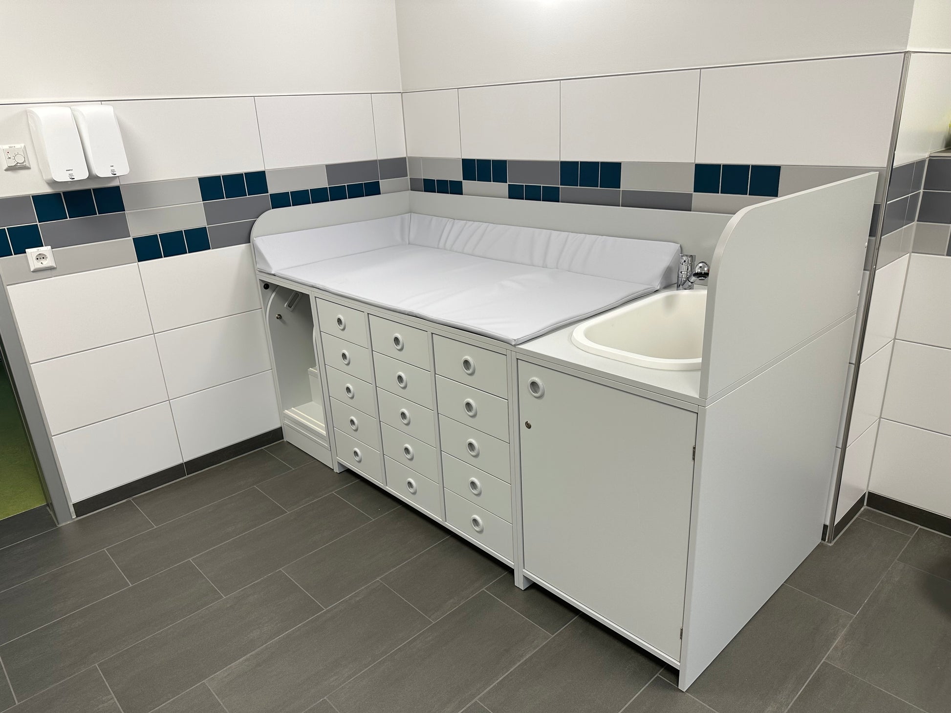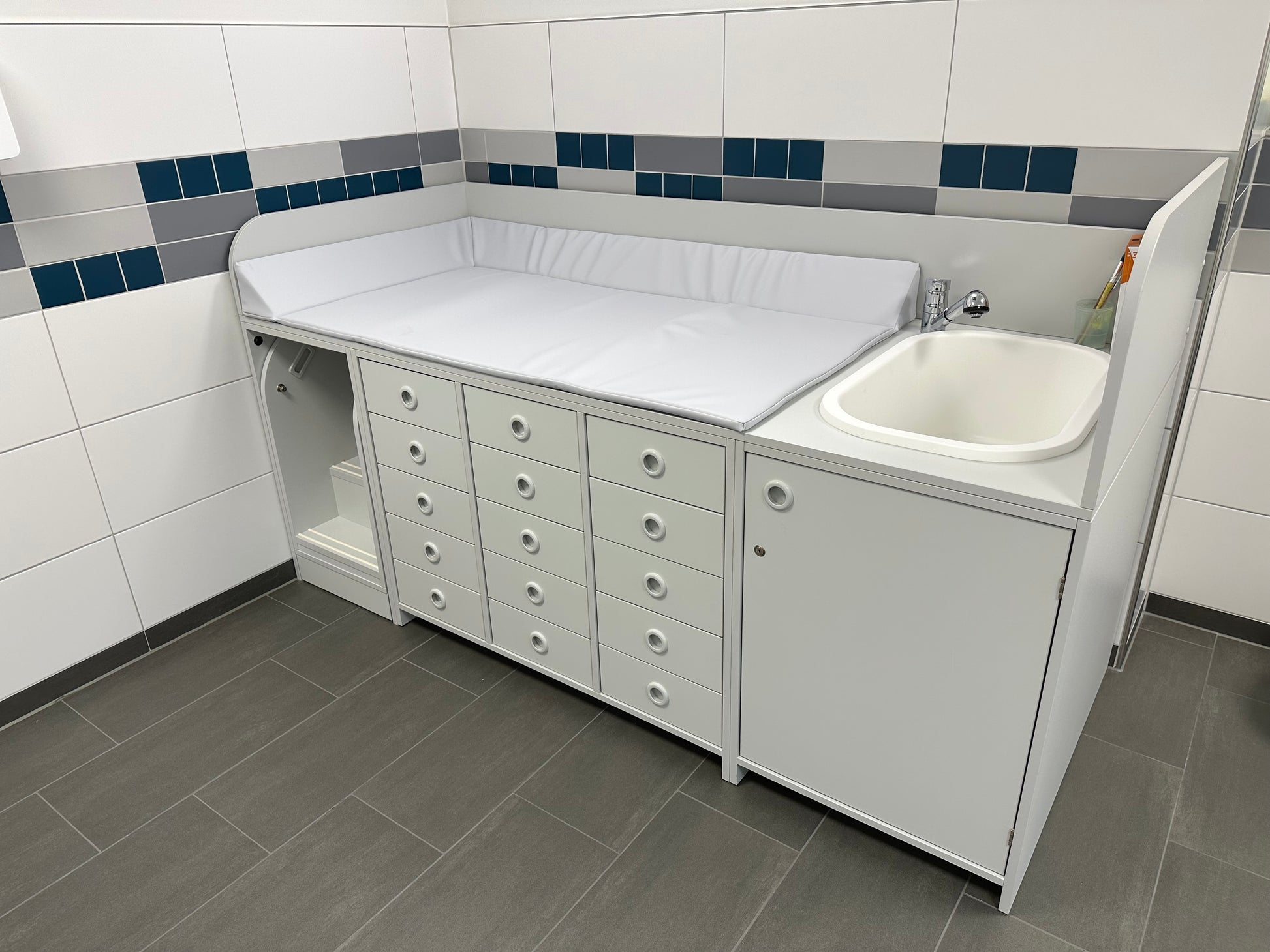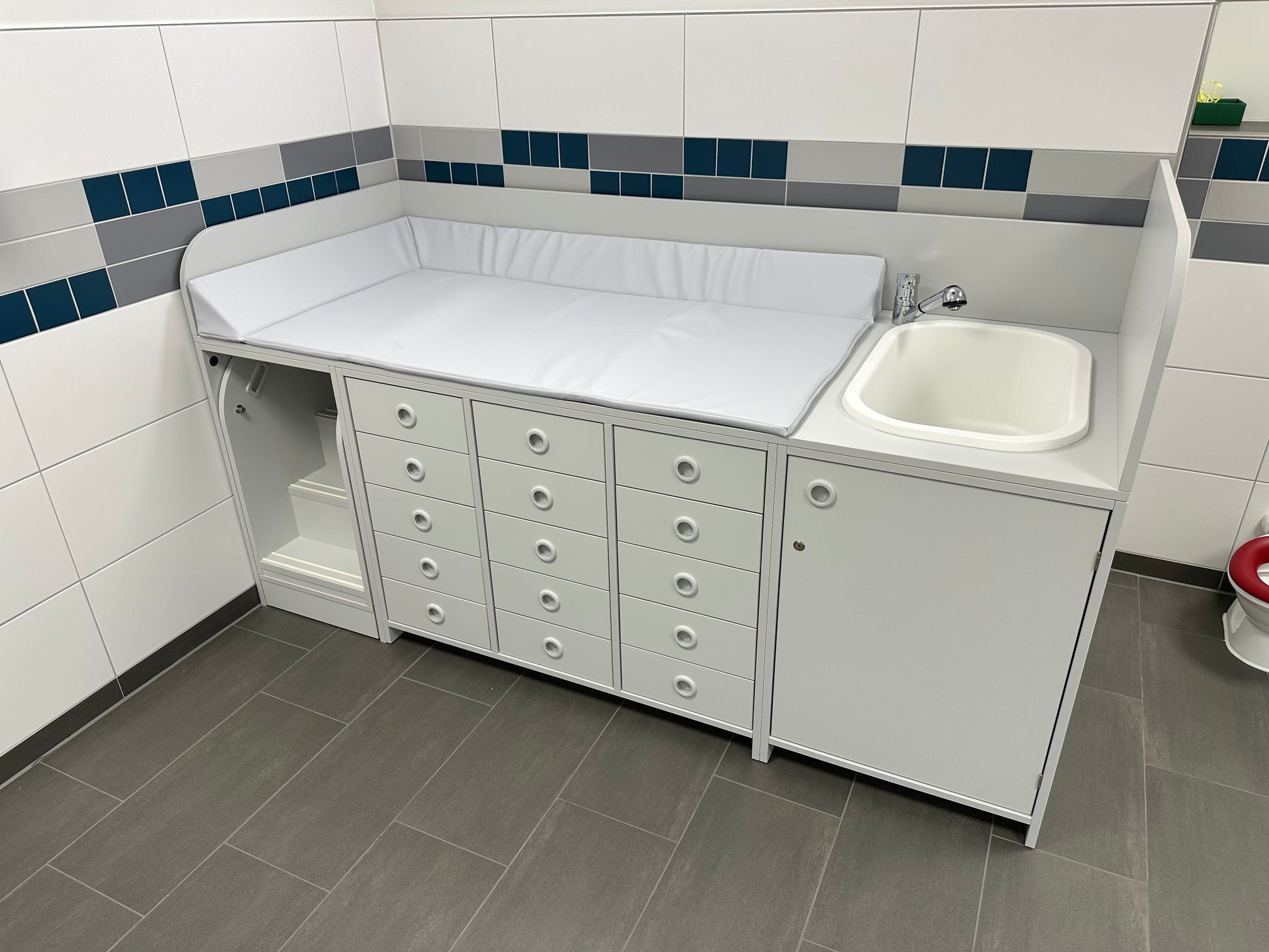Vielseitige Wickelkommode mit Treppe, Schüben und Badewannenschrank